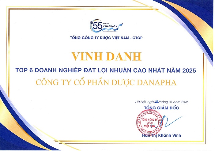 Theo đó, Công ty Cổ phần Dược Danapha vinh dự được xướng tên trong Top 6 doanh nghiệp đạt lợi nhuận cao nhất năm 2025, khẳng định hiệu quả hoạt động và vị thế của Danapha trong nhóm doanh nghiệp dược hàng đầu Việt Nam. Kết quả này là sự ghi nhận xứng đáng cho những nỗ lực bền bỉ của tập thể lãnh đạo và người lao động Công ty trong việc duy trì tăng trưởng ổn định, nâng cao hiệu quả quản trị và năng lực cạnh tranh.